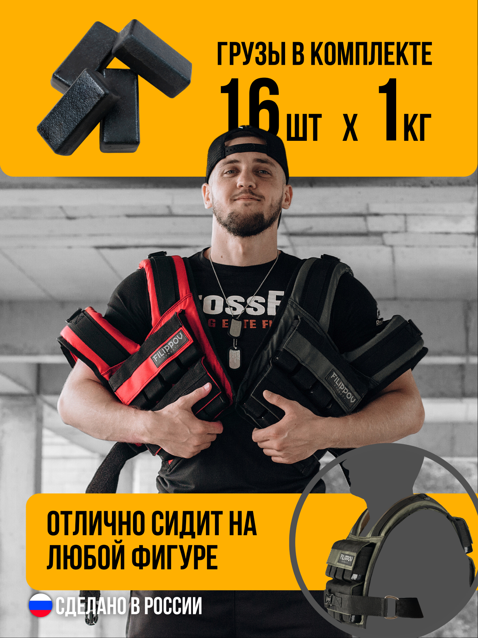 Изготовлен: - Особопрочный материал с влагоотталкивающей пропиткой выдерживающий высокие, интенсивные нагрузки. - Изделие усилено лавсановыми стропами в местах активных нагрузок и прошит двойным капроновым швом. - Данный вид жилета позволяет регулировать вес от 1кг до 18кг чугунными грузиками. - Жилет имеет проработанную, комфортную, анатомическую посадку, за счет чего не сбивается дыхание и спортсмен может выполнять упражнения с максимальной эффективностью. - Также данная модель отличается правильной посадкой плечевых лямок. Они не давят и не натирают. - Универсальный размер от 42 до 56 Жилет подходит спортсменам с разным уровнем подготовки от любителей до профессионалов. 14 дней тест-драйва! Если не подойдет жилет, мы вернем вам деньги! 16 съемных грузиков входят в стоимость жилетаВы можете выбрать один из вариантов оплаты: