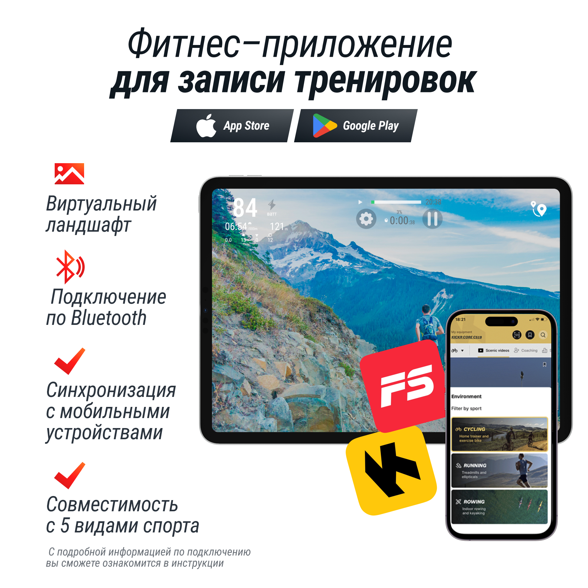 Также, имеется возможность синхронизации беговой дорожки с мобильным устройством при помощи приложений FitShow и Kinomap (подключение через Bluetooth) с возможностью управления беговой дорожкой и сохранения тренировок.