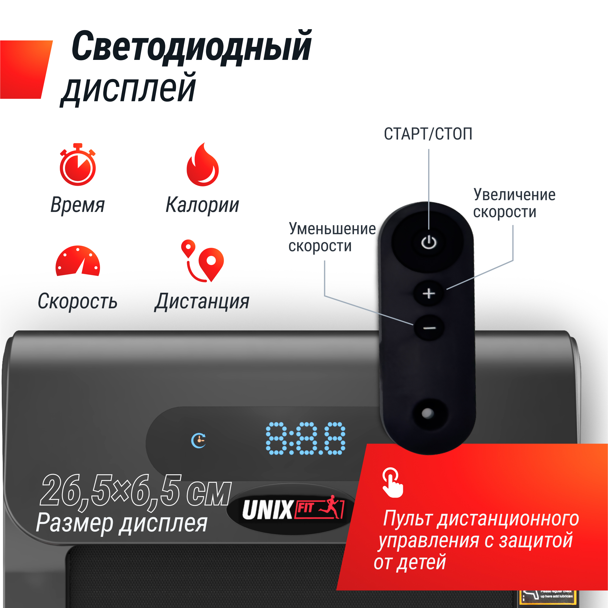 Встроенный дисплей с иконками-индикаторами отображают важные показатели – время, скорость, дистанцию и сожженные калории. Вы сможете отслеживать свои достижения и видеть прогресс, что станет дополнительной мотивацией для дальнейших тренировок. Антискользящее беговое полотно 100 х 42 см и система амортизации электрической дорожки для бега и ходьбы обеспечивают максимальную безопасность во время тренировок, а бесшумный двигатель позволяет заниматься в любое время суток, не беспокоя соседей и домашних.