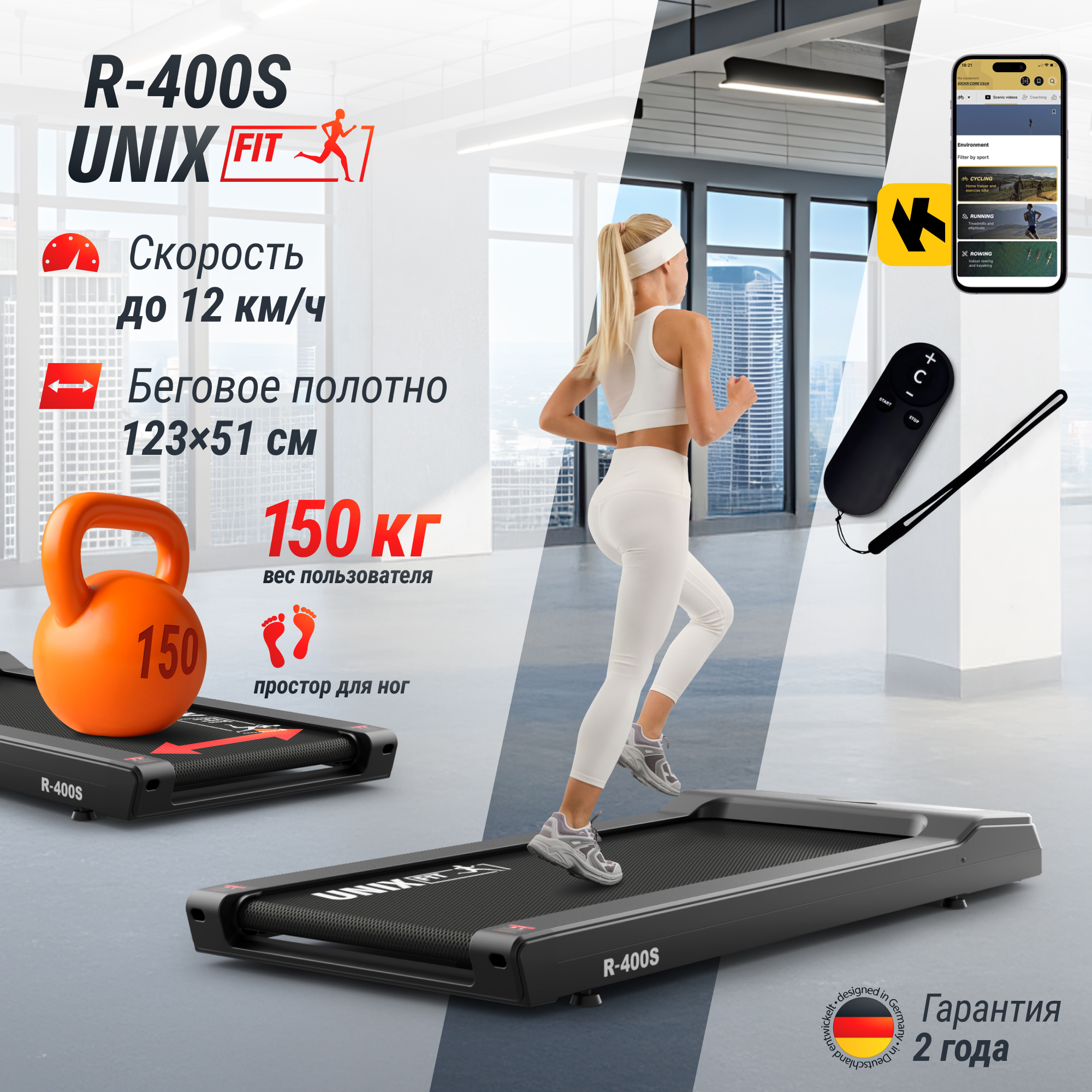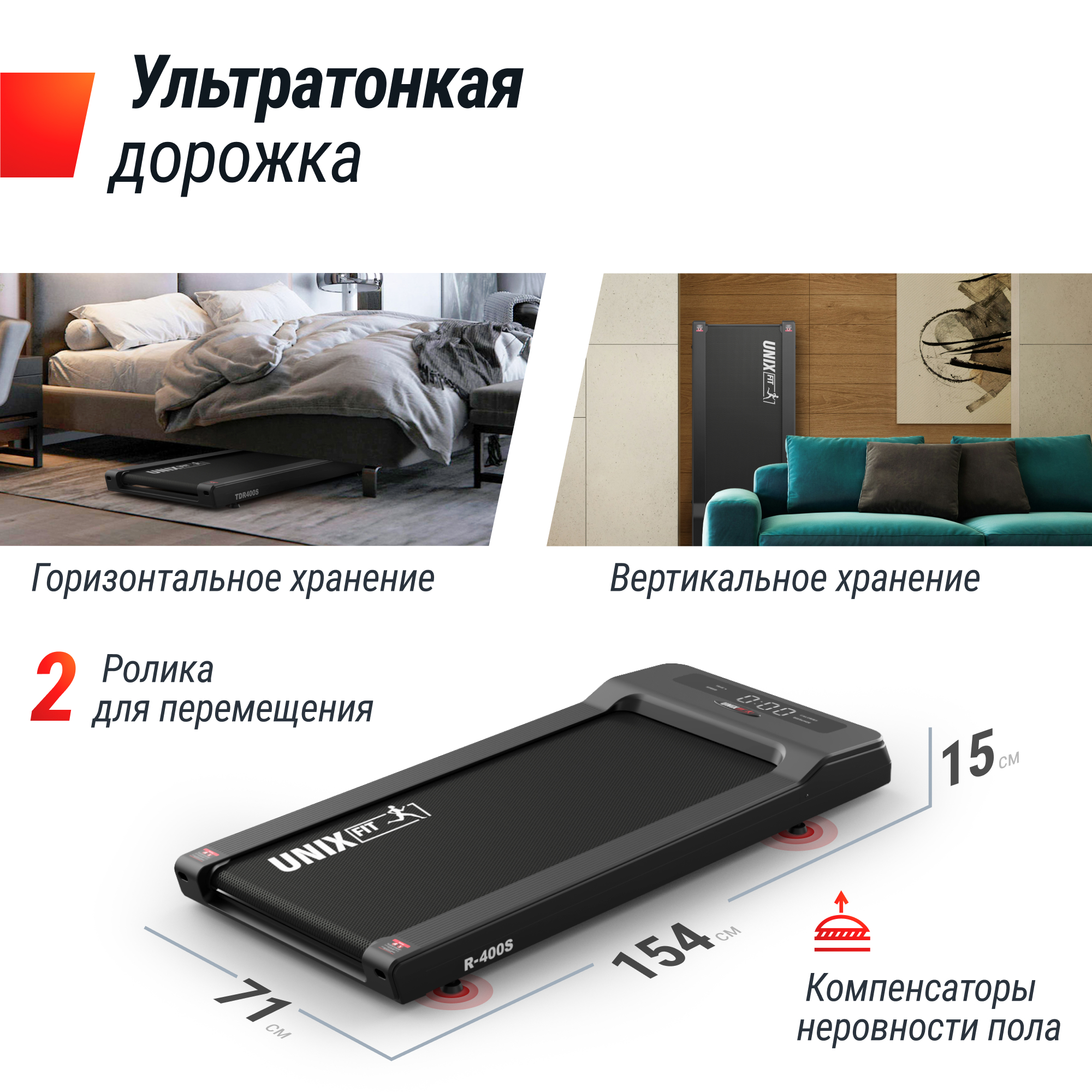 Уникальной особенностью беговой дорожки UNIX Fit R-400S является ее компактность и тонкость. Обладая небольшими размерами в рабочем состоянии 154 х 71 х 15 см, дорожка имеет мощный двигатель с пиковой мощностью 4.0 л.с., который поможет разогнать ее до 12 км/ч. Воздушное охлаждение двигателя и низкий уровень шума (25-30 Дб) позволят проводить занятия даже в небольших помещениях. Результаты тренировок не заставят себя долго ждать, ведь дорожка является отличным кардиотренажером для укрепления рук и ног, помогая улучшить общее физическое состояние и привести себя в отличную форму.