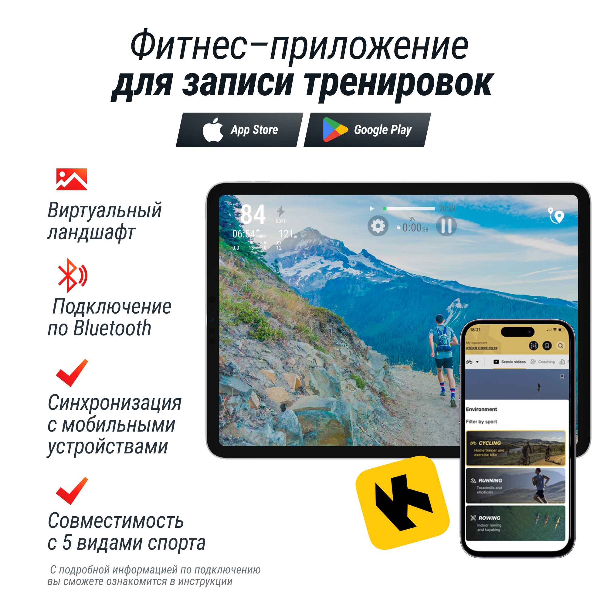 Большой LED экран 47,5 х 9,5 см с 4-мя окошками-стикерами отобразит текущие показатели времени, скорости, дистанцию и потраченные калории. Компьютер дорожки можно синхронизировать с популярными приложениями Kinomap (подключение через Bluetooth). В приложениях можно создать индивидуальный план тренировок, отслеживать прогресс и ставить новые фитнес-цели!
