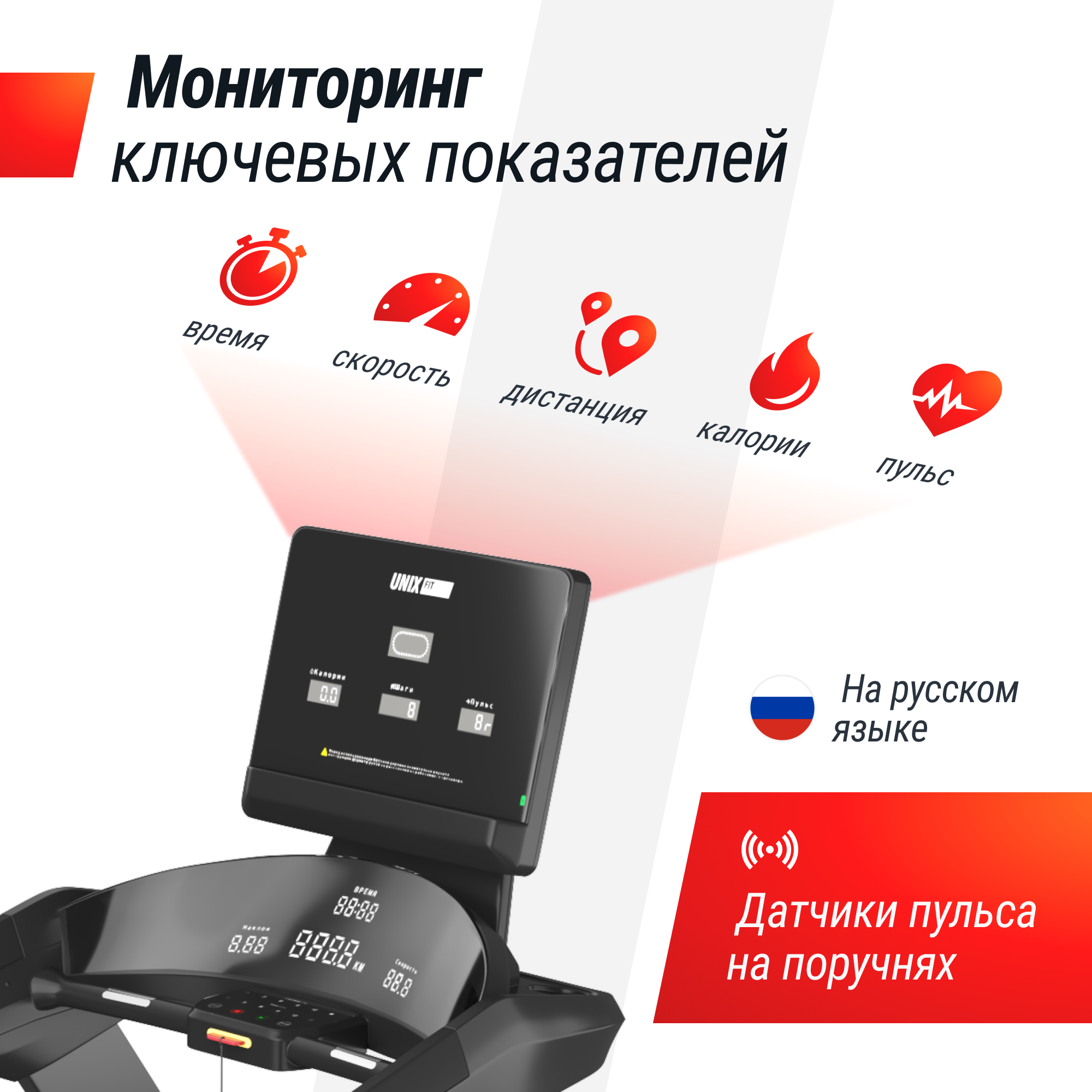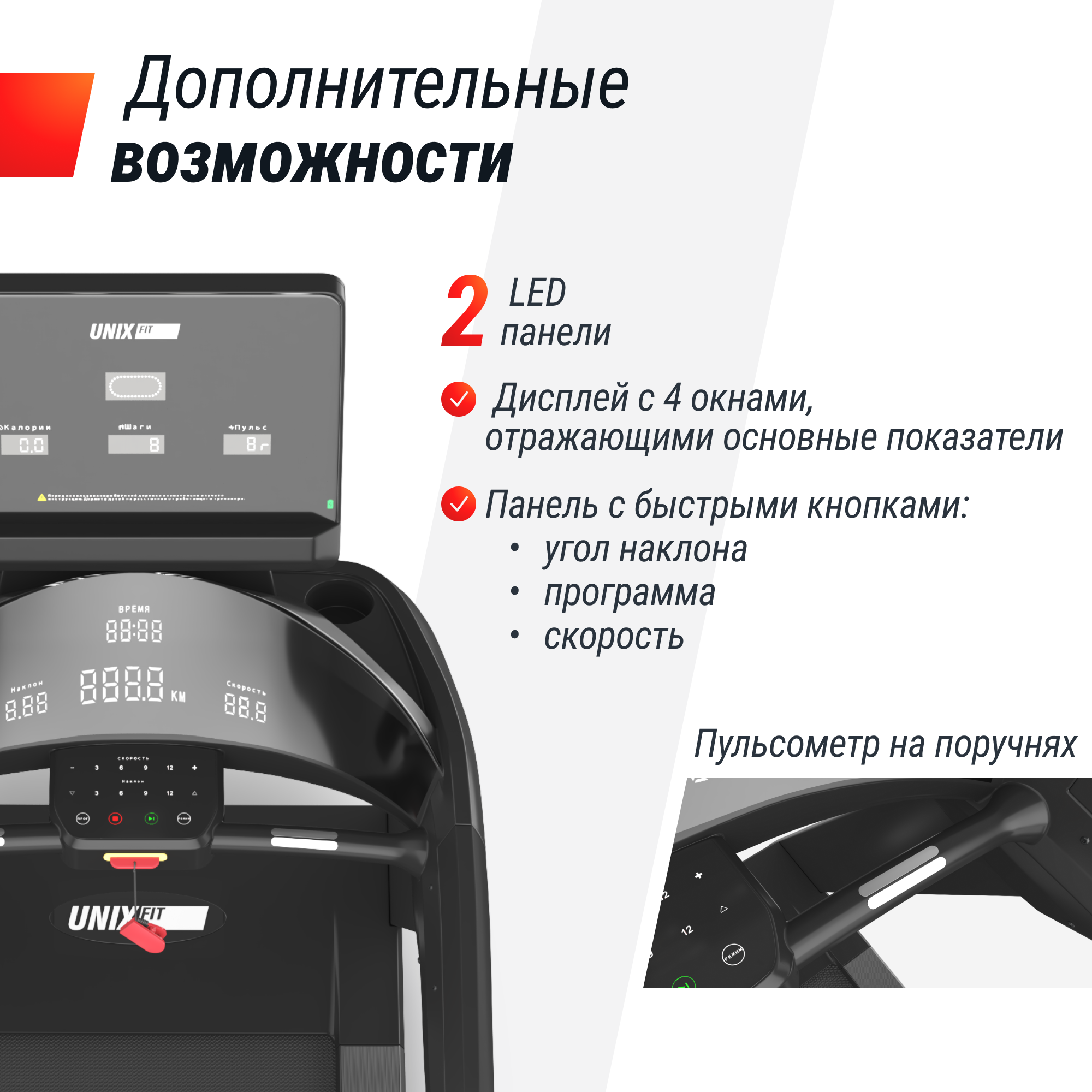 - Пульсометры на поручне. Измерение частоты сердцебиения происходит, когда пользователь держится за пульсометры на поручне обеими руками. Система автоматически определяет частоту сердцебиения и отображает ее на круглом джойстике. Чем быстрее мы бежим, тем больше кислорода требуется мышцам и чаще сокращается сердце. Беговая тренировка очень полезна для сердца и и...