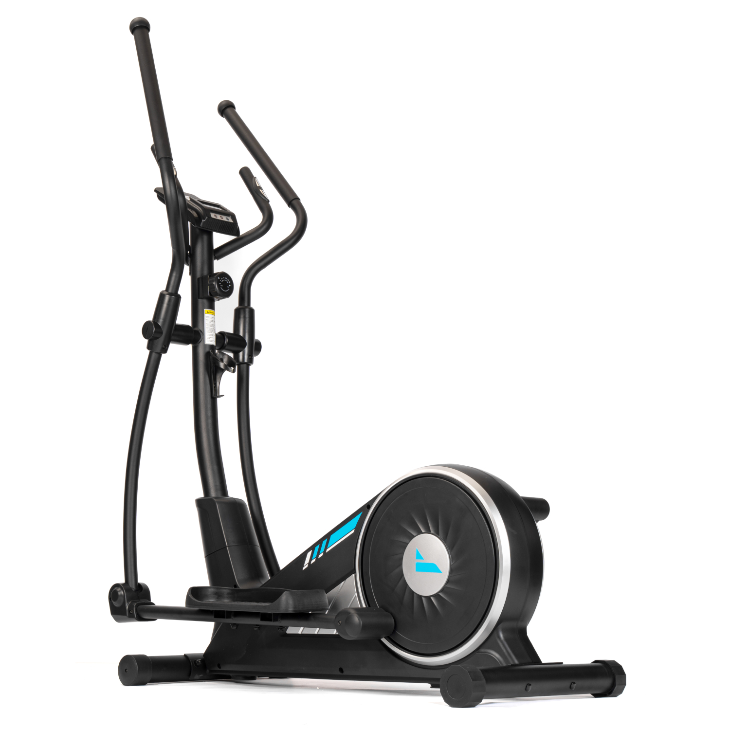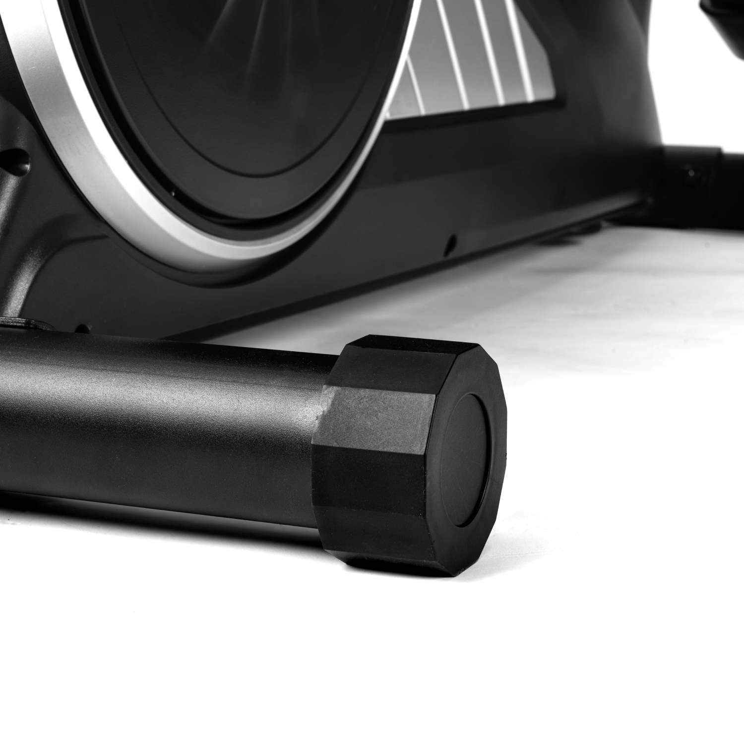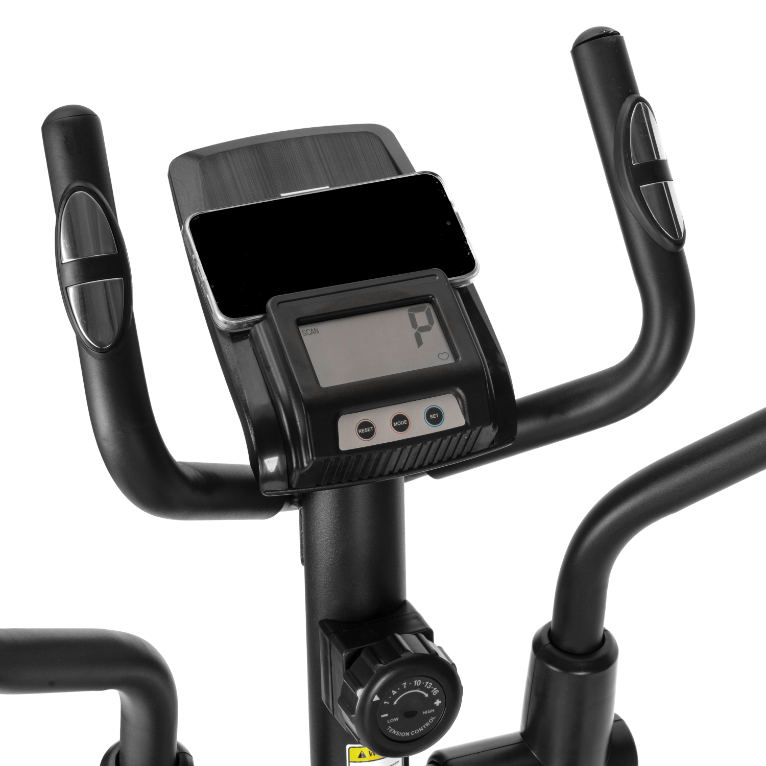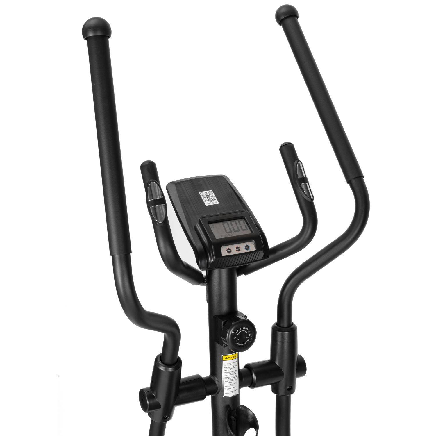 Тренажёр оснащён монохромным LCD-дисплеем, который отображает основные параметры тренировки: время, дистанцию, скорость, количество сожжённых калорий, пульс, общую дистанцию и режим сканирования. Для контроля состояния организма во время тренировки на поручнях установлены сенсорные датчики пульса. Дисплей работает от двух батареек типа AA (в комплект не входят). Эллипсоид стоит устойчиво благодаря компенсаторам неровности пола, легко перемещается на транспортировочных роликах, а подставка под планшет и держатель для бутылки держат всё необходимое под рукой.