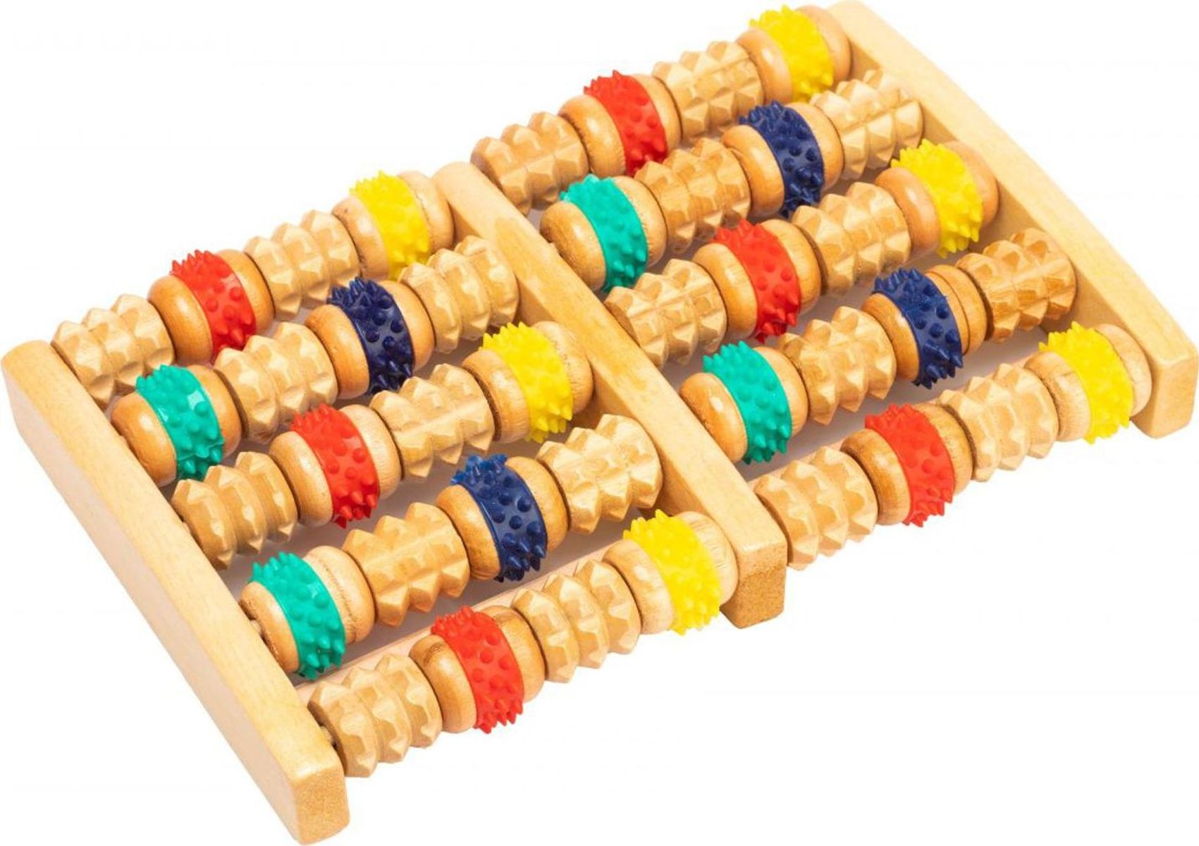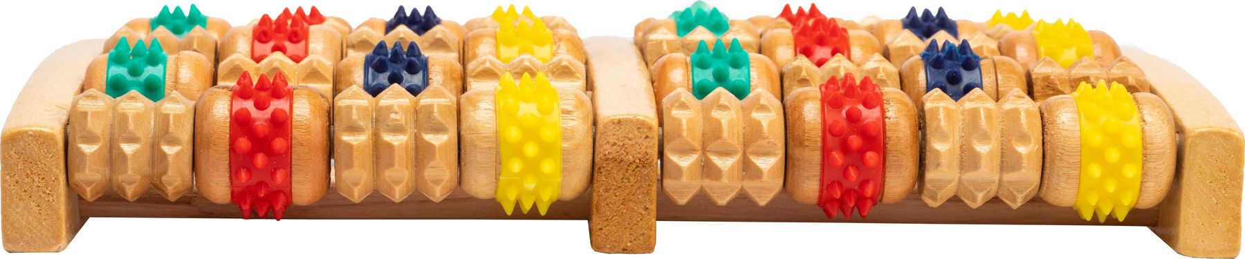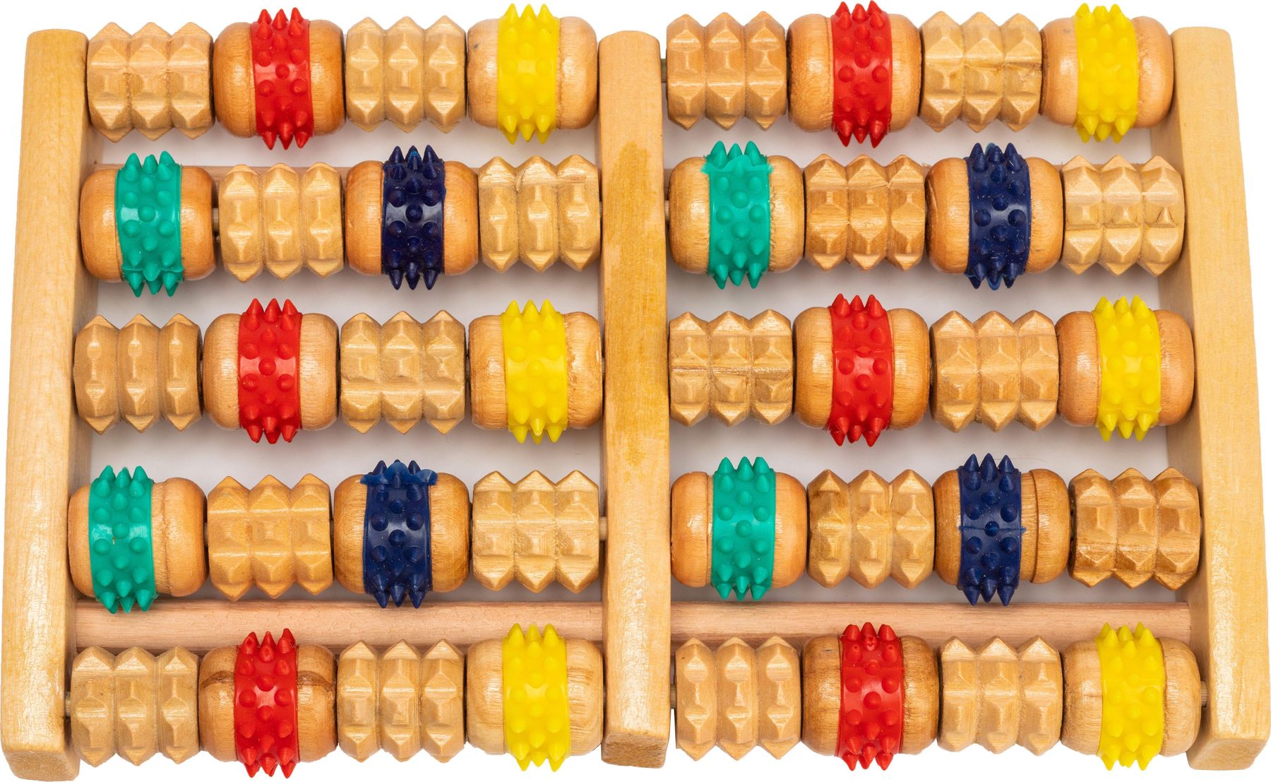 Массажер из натурального дерева приятен на ощупь, практичен и долговечен. 40 массажных роликов с разными видами шипов (дерево/резина) для акупунктурного массажа ступней, рук, спины и других частей тела.   Такой деревянный массажер с роликами – самое простое решение для релаксации и снятия мышечного напряжения.  Используйте роликовый массажер дома, в офисе, на даче, в долгой поездке, даже в бане после парной.  Преимущества: ●    Удобный размер для одновременного массажа двух стоп или ладоней.  ●    Сочетание мягких резиновых и жестких деревянных шипов. ●    Безопасные и долговечные материалы.