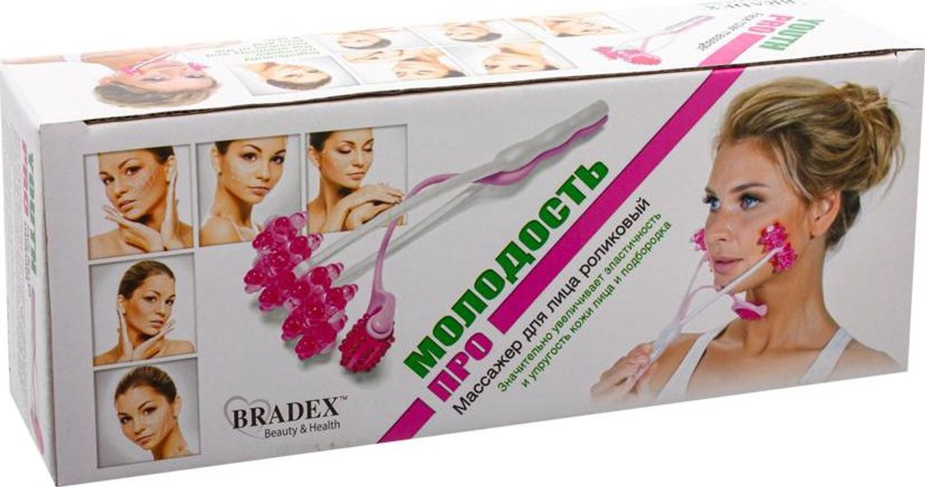 Удивительный массажер для лица роликовый «МОЛОДОСТЬ ПРО» создан для ухода за Вашей кожей. С его помощью Вы будете с радостью смотреть в зеркало даже после тяжелой трудовой недели, поскольку Ваше лицо не выдаст признаков усталости. Массажер для лица роликовый «МОЛОДОСТЬ ПРО» значительно увеличивает эластичность и упругость кожи лица и подбородка, что обеспечивает разглаживание морщин, снижение припухлостей, вызываемых усталостью.   Преимущества: •    Массирует три лицевые зоны одновременно •    Увеличивает всасываемость питательных веществ из косметических кремов и масел •    Обеспечивает повышение эластичности кожи •    Гарантирует подтянутость тканей лица и подбородка •    Не травмирует кожу  Помогите себе стать моложе и привлекательнее с роликовым массажером для лица «МОЛОДОСТЬ ПРО»!