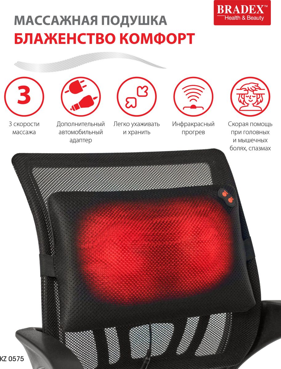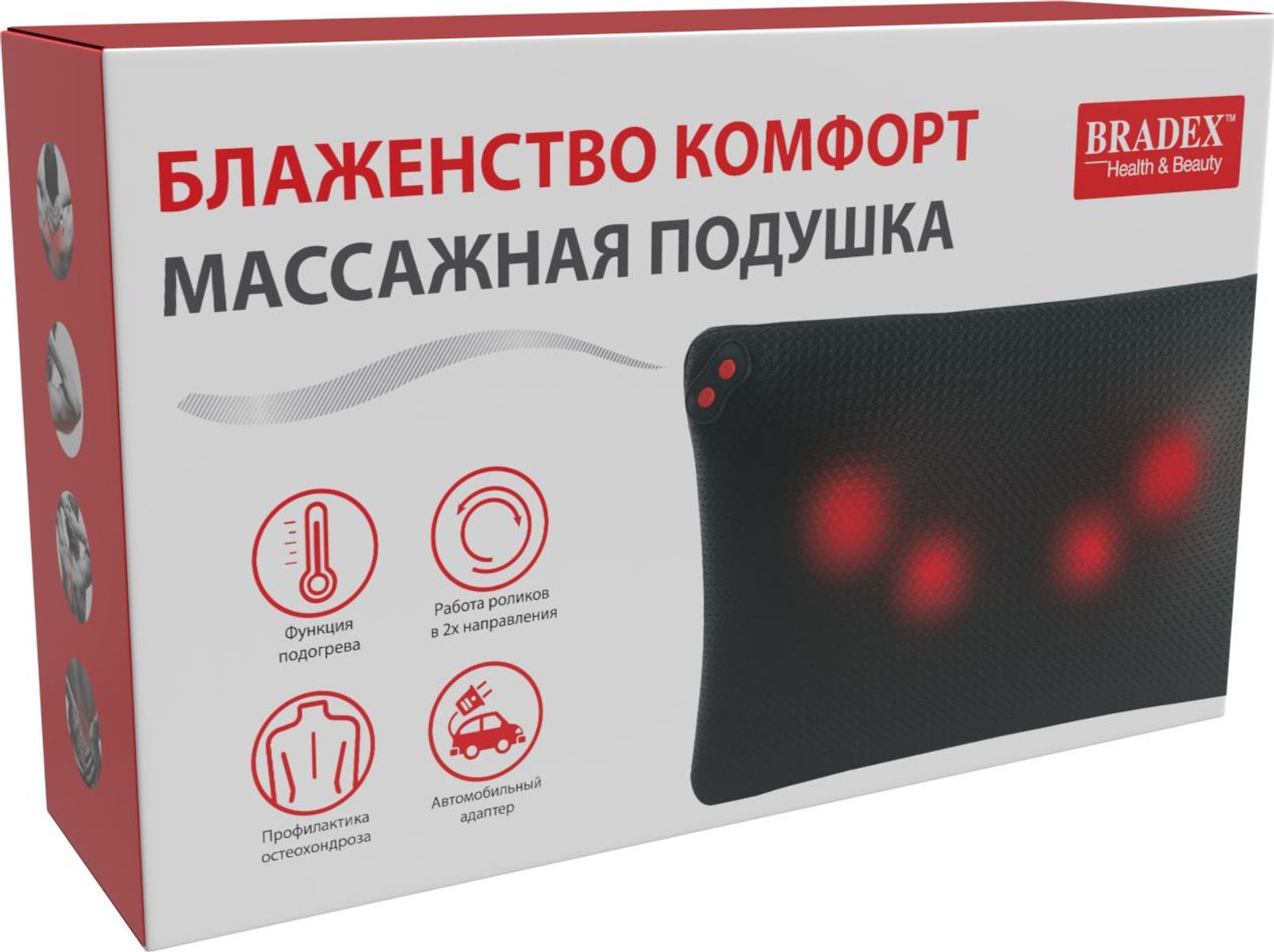 Дополнительный прогрев усиливает общий расслабляющий, оздоравливающий эффект: кровь приливает к мышцам, стимулируя обмен веществ. Роликовый массаж улучшает общее состояние. Проходят головные боли и усталость, восстанавливается работоспособность, полноценный сон. Массаж живота способствует улучшению желудочно-кишечной функции, стимулирует процессы пищеварения, всасывания, перистальтики. Электрический массажер станет незаменимым помощником людям, ведущим малоподвижный образ жизни, офисным работникам и автомобилистам. Эластичный ремень на липучках помогает легко прикрепить подушку к автомобильному сиденью. В дороге устройство работает от прикуривателя и быстро разомнет затекшие мышцы, придаст бодрости. Подушка-массажер выполнена из качественных материалов, приятных на ощупь, не раздражающих даже чувствительную кожу. Устройство легко чистить и хранить.