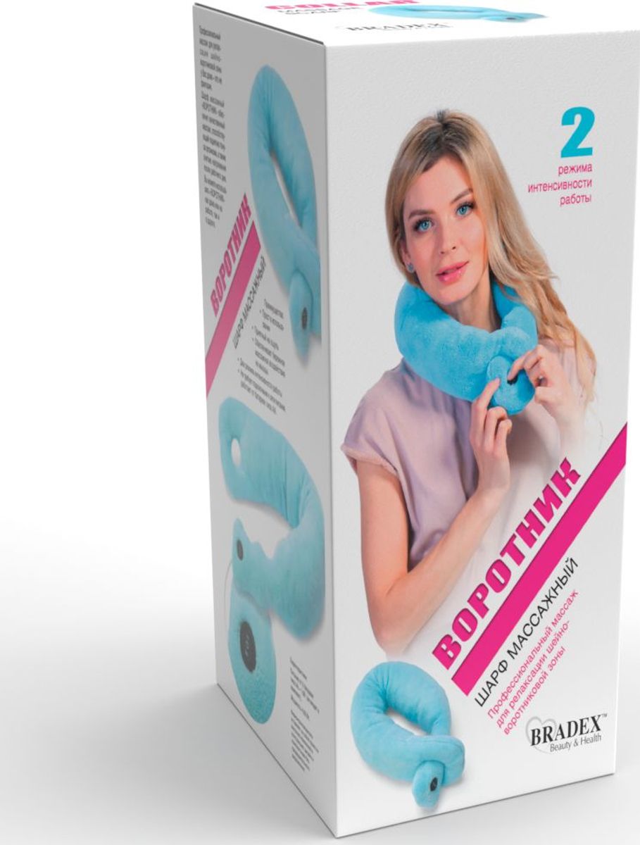 Шарф массажный «ВОРОТНИК» не только согреет Вас с комфортом и одарит уютом дома и в поездке, но также обеспечит приятный массаж поясницы, шеи и даже ног. Массажер для шеи «ВОРОТНИК» подарит приятный массаж и снимет усталость. Способствует уменьшению стресса и улучшению самочувствия в целом.  Мягкий материал приспособления и его вибрация оказывают расслабляющий и успокаивающий эффект на мышцы шеи и плеч.   - Улучшает  циркуляцию крови, снимает дискомфорт в позвоночнике и шее, способствует нормализации сна.  - Благодаря мягкому приятному покрытию не вызовет раздражения кожи. Его прикосновение принесет Вашей коже истинное удовольствие.  - Удобная регулируемая застежка! Можно использовать не только на шее, но и также на пояснице или на ногах. - Способствует улучшению сна и нормализации кровообращения. - Незаменим при долговременном путешествии в автобусе, автомобиле и самолёте. - Компактный прибор, легок в переноске, легко складывается и помещается в сумочку. - Приятные глазу расцветки.