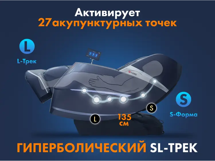 Гиперболическая SL-траектория длиной 135 см, охватывающая 27 рефлекторных точек тела, делает массаж более эффективным