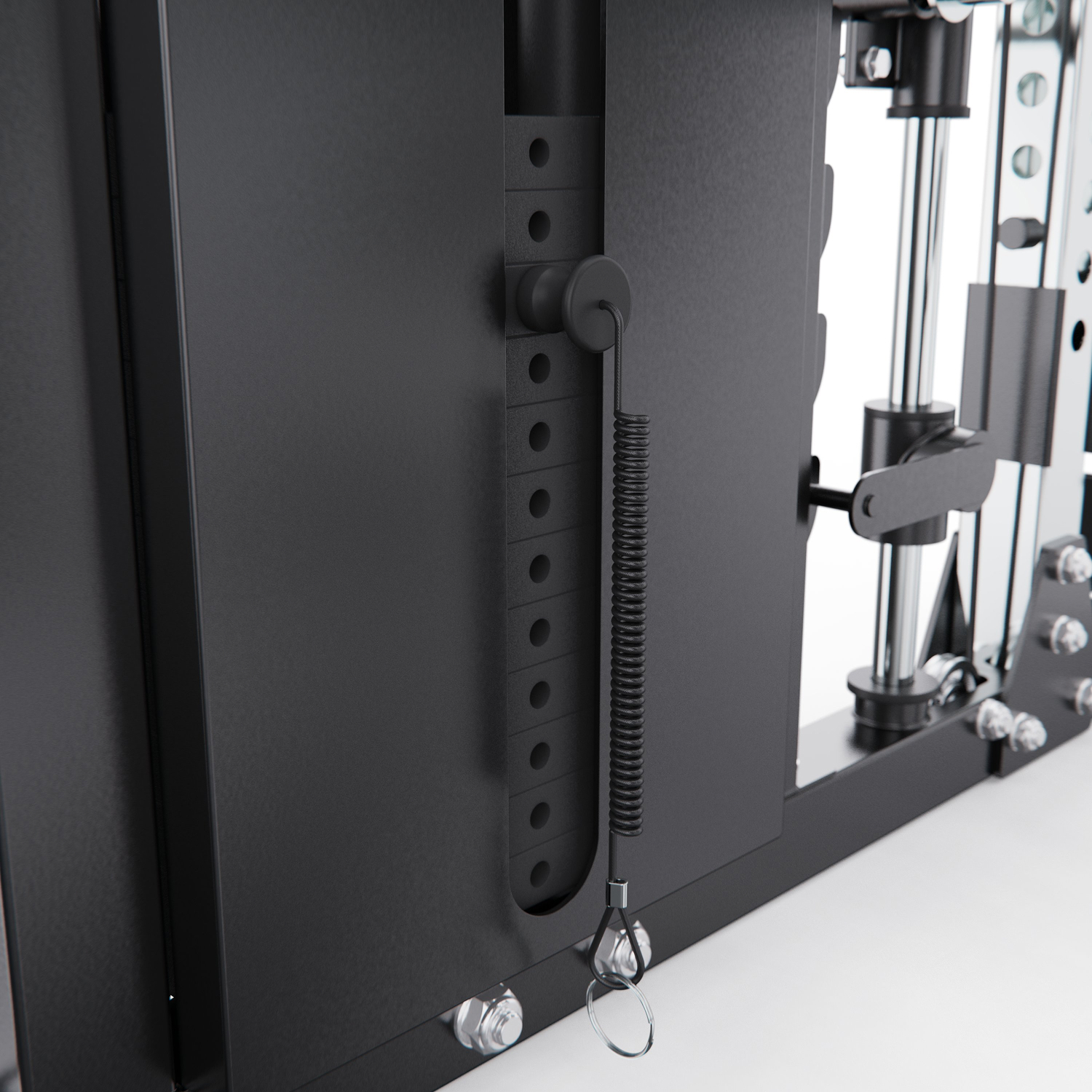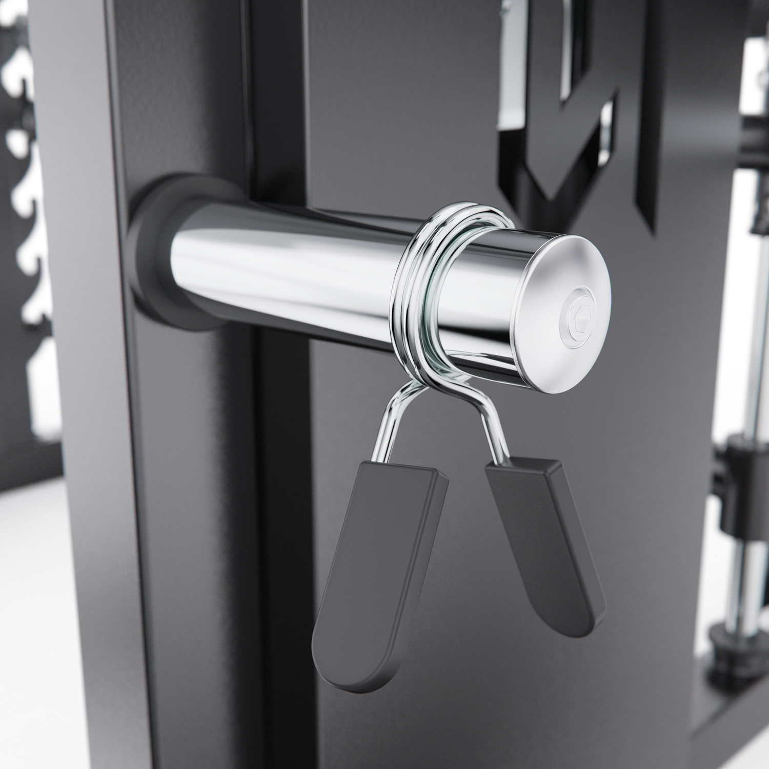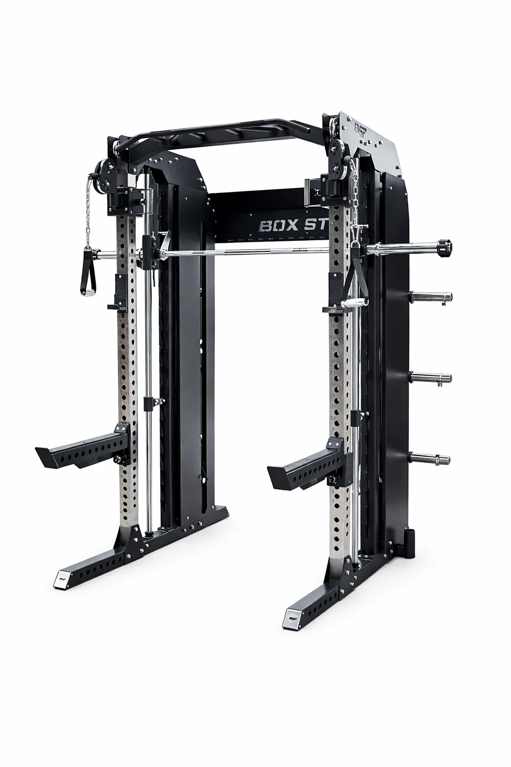 Мультистанция позволяет выполнять широкий спектр упражнений: занятия на кроссовере, приседания, выпады, тяги к поясу, упражнения на бицепс и трицепс, а также подтягивания на перекладине. В нижней части рамы предусмотрено специальное отверстие для выполнения упражнений в стиле Лэндмайн, что расширяет возможности тренировки плеч и корпуса.