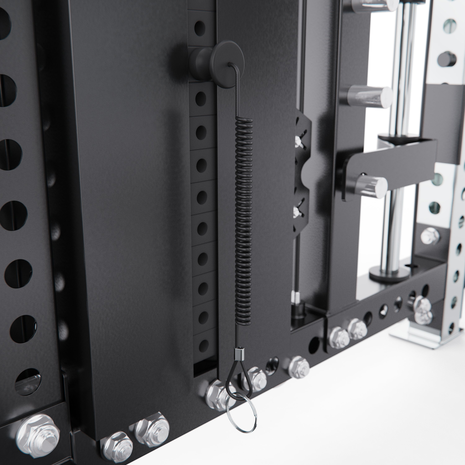 Мультистанция позволяет выполнять широкий спектр упражнений: занятия на кроссовере, приседания, выпады, тяги к поясу, упражнения на бицепс и трицепс, а также подтягивания на перекладине. В нижней части рамы предусмотрено специальное отверстие для выполнения упражнений в стиле Лэндмайн, что расширяет возможности тренировки плеч и корпуса.