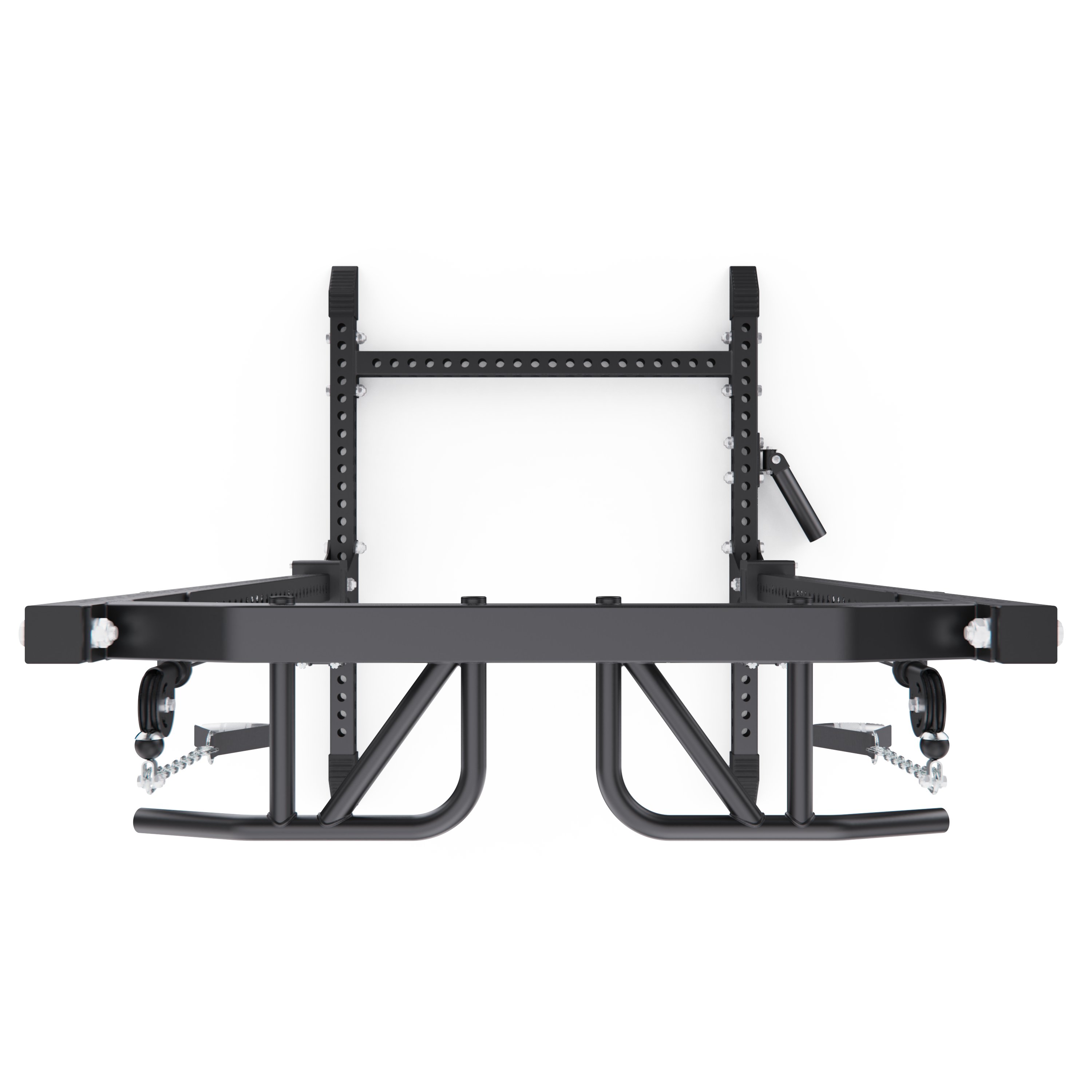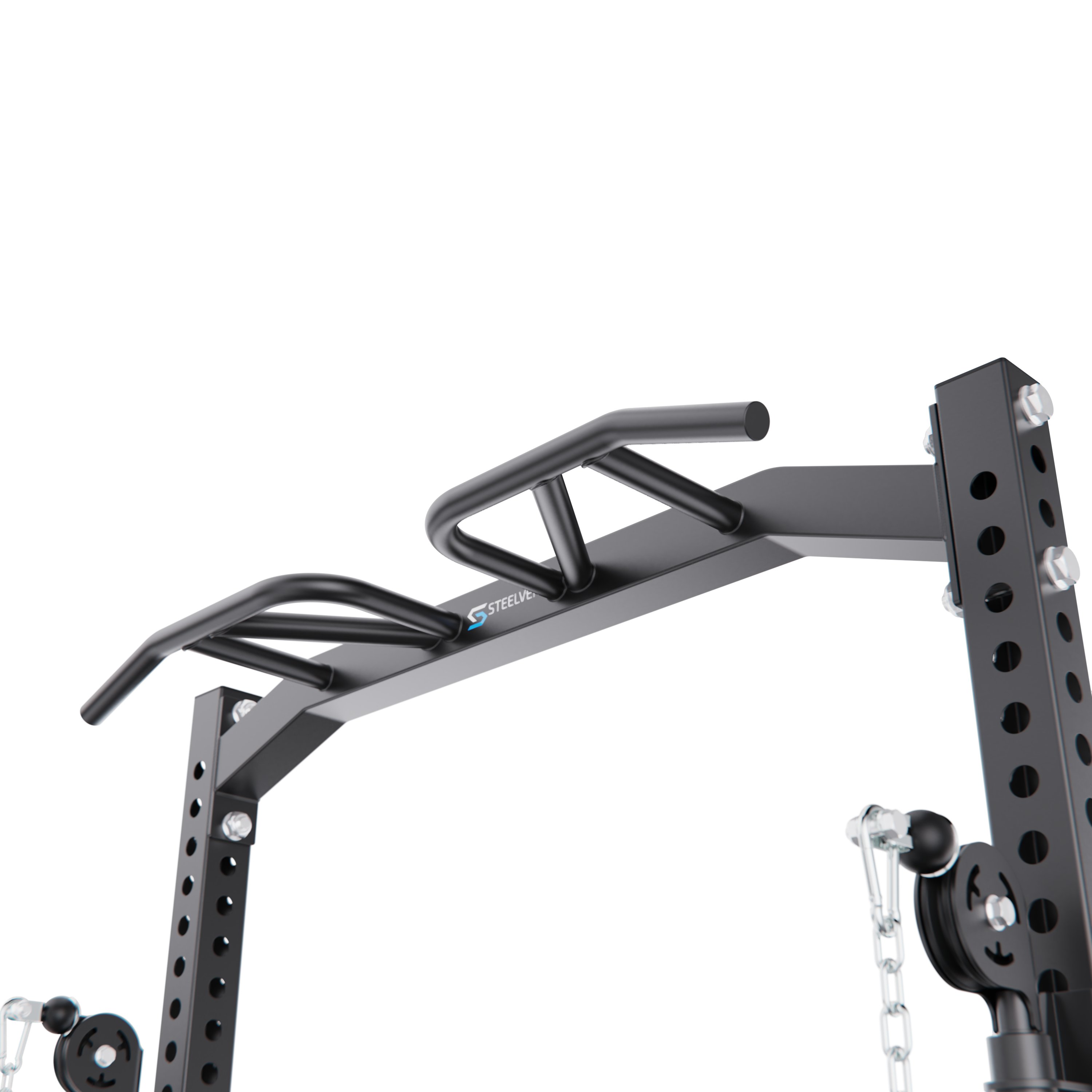 Встроенный кроссовер расширяет функциональность тренажера и позволяет прорабатывать все основные группы мышц. Кроме того, с одной стороны рамы предусмотрено специальное отверстие для установки грифа, которое позволяет использовать раму как Лэндмайн, выполняя жим и другие упражнения с естественной амплитудой движения.