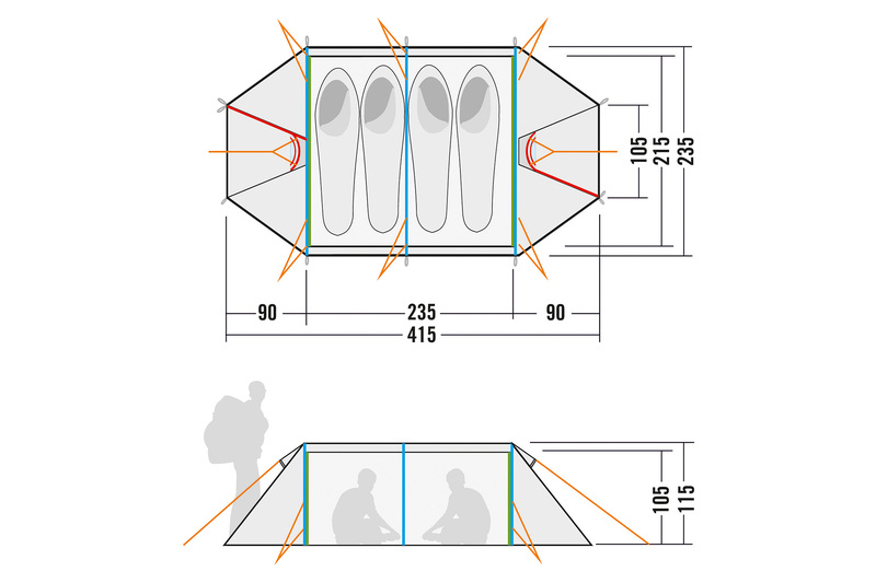Во внешнюю и внутреннюю палатку можно войти с обеих сторон тамбура.