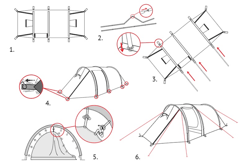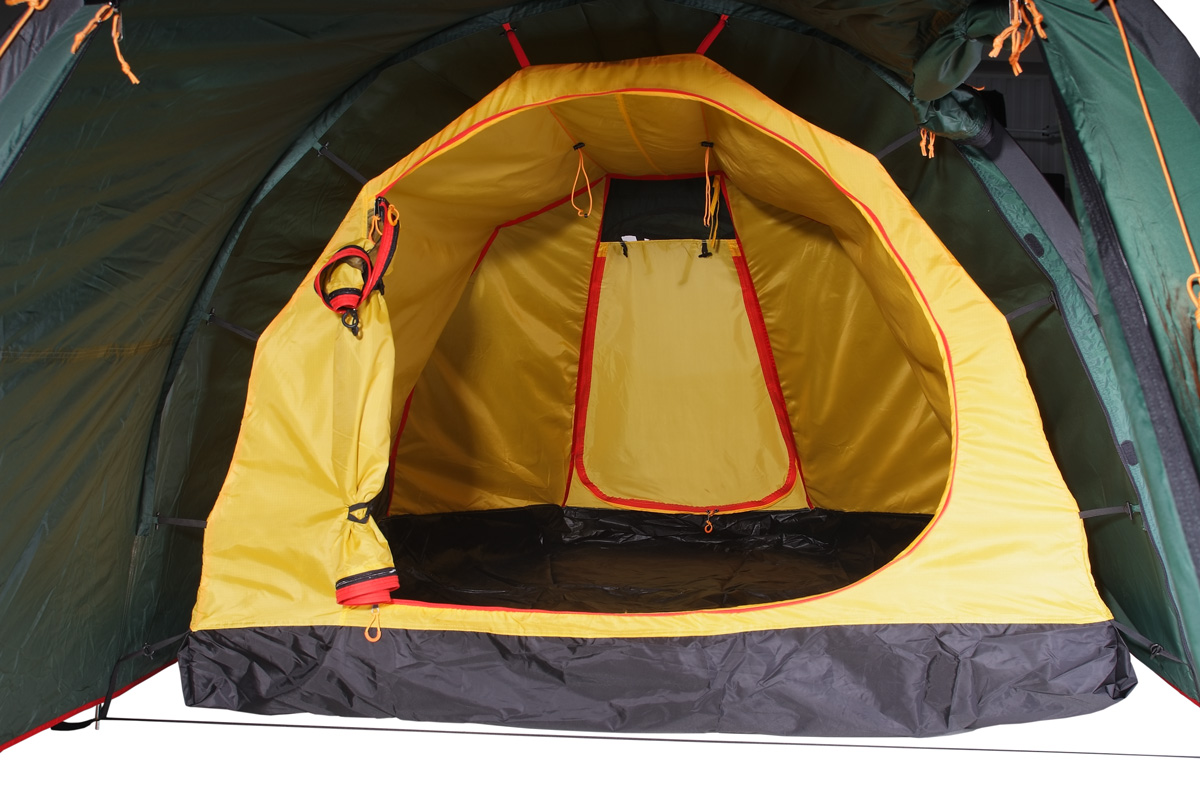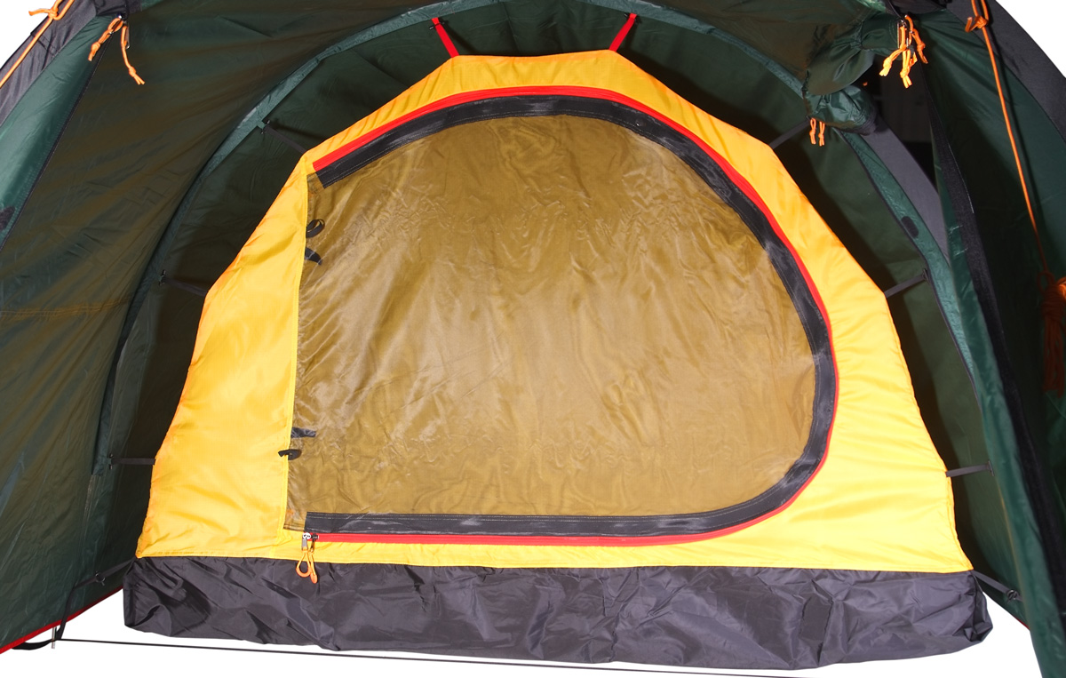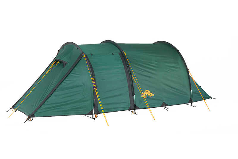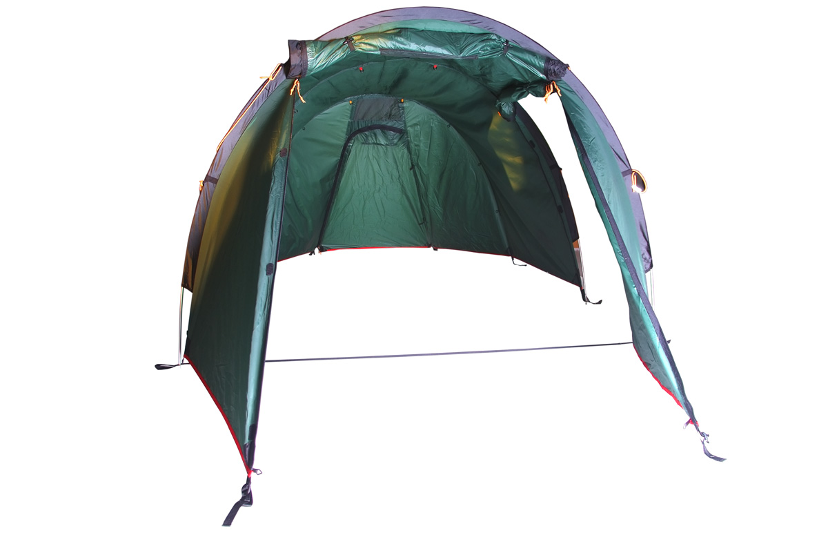 Палатка легко устанавливается, причем сначала ставится внешний тент, а потом под него подвешивается спальня. Удобство такой конструкции легко оценить при установке или демонтаже палатки под дождем, когда намокает только внешний тент, а спальня и вещи остаются сухими. Двухточечные оттяжки и специальные стропы с фастексом позволяют равномерно натянуть тент и обеспечивают хорошую ветроустойчивость. Молнии тента снаружи защищены по всей длине от дождя специальными клапанами. Клапаны вшиты отдельным проклеенным швом и фиксируются липучкой. Без установленной спальни большое внутреннее пространство палатки можно использовать под склад или кают-компанию. Спальня палатки выполнена из легкого дышащего материала, имеет на входе антимоскитную сетку и полог, вентиляционное окно и кармашки для разных мелочей. Антимоскитная сетка и полог застегиваются отдельными молниями разного цвета. Спальня рассчитана на трех человек, но при необходимости, например переждать непогоду, в ней могут разместиться четверо.