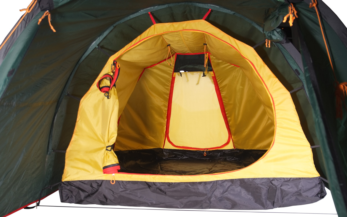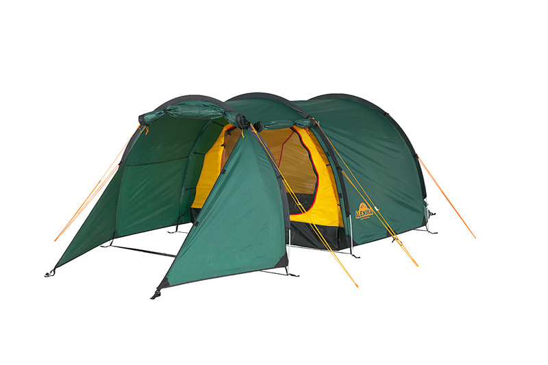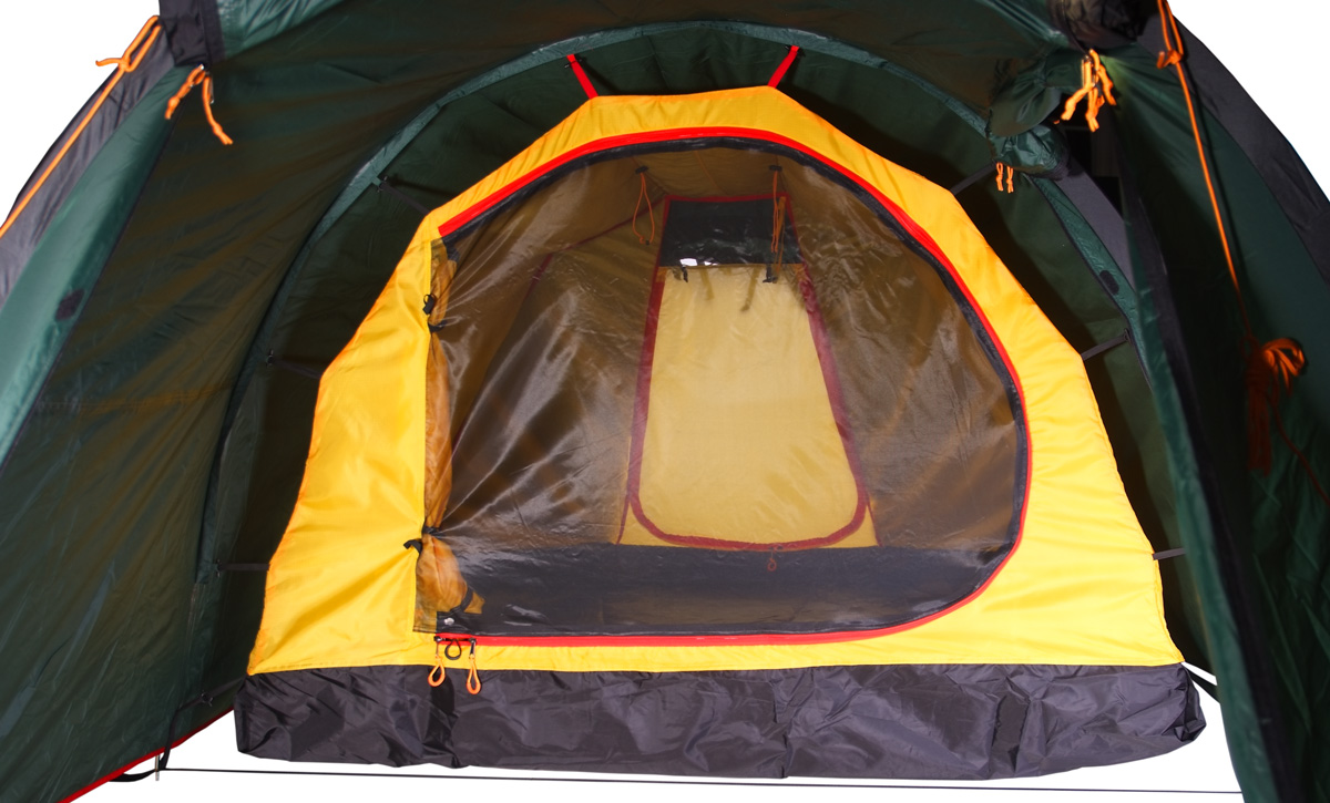 Палатка легко устанавливается, Причем сначала ставится внешний тент, а потом под него подвешивается спальня. Удобство такой конструкции легко оценить при установке или демонтаже палатки под дождем, когда намокает только внешний тент, а спальня и вещи остаются сухими. Точки крепления спальни промаркированы цветом для удобства сборки. Двухточечные оттяжки и специальные стропы с фастексом позволяют равномерно натянуть тент и обеспечивают хорошую ветроустойчивость. Молнии тента снаружи защищены по всей длине от дождя специальными клапанами. Клапаны вшиты отдельным проклеенным швом и фиксируются липучкой. Без установленной спальни большое внутреннее пространство палатки можно использовать под склад или кают-компанию.